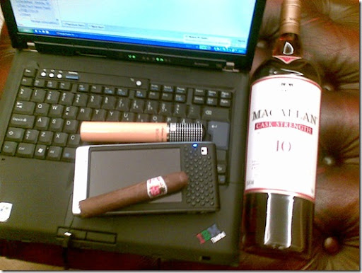 Saturday night. It is time to put gadgets aside and turn to other pleasures. Habanos, the best cigars out there. Hoyo de Monterrey Epicure No.2 and Cohiba Siglo VI. Macallan single malt scotch whisky. 10 years old. Cask strength (58.4%Vol). Last comparative shot before uncorking and lighting up. Bye.