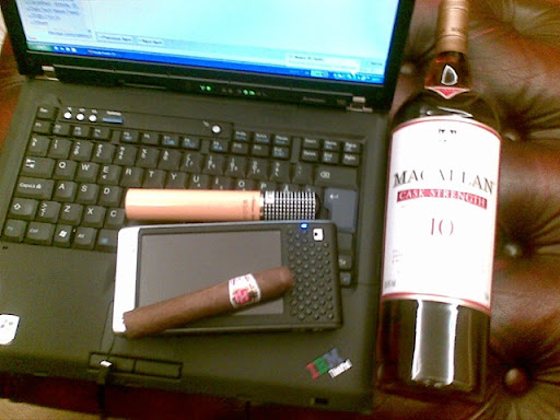 Saturday night. It is time to put gadgets aside and turn to other pleasures. Habanos, the best cigars out there. Hoyo de Monterrey Epicure No.2 and Cohiba Siglo VI. Macallan single malt scotch whisky. 10 years old. Cask strength (58.4%Vol). Last comparative shot before uncorking and lighting up. Bye.